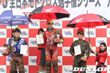 今季も熊本県のHSR九州が舞台となった開幕戦は、レースウィークに雨が降り続き、マディコンディションで実施された。木曜日から、ときには強く降った雨は、決勝日のお昼ごろにようやく止んだが、路面状況は最後まで大きく改善されることはなかった。そんな状況のなか、全日本最高峰のIA1でまず力を発揮したのが世界選手権帰りの山本選手。決勝ヒート1では、1周目を3番手でクリアして2番手争いに加わると、レースが後半に入ったところで2番手にポジションアップ。トップのライダーには離されてしまったが、そのまま2位でゴールした。また小方選手は、レース序盤から順位を守ると、最終ラップには前を走るライダーに肉迫。わずか1秒差で逆転はならなかったが、5位でフィニッシュした。