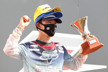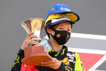 3番手争いは、2周目に能塚選手が先行。4周目には、能塚選手が2番手に浮上したが、6周目に再逆転を許した。そして迎えた9周目の最終ラップ、再びトップ争いは激しさを増し、お互いにマシンをぶつけるラフなファイトに。2度目の接触で両者が転倒し、この間に2台をパスした能塚選手が優勝、渡辺選手が2位となった。富田選手は5位でゴール。能塚選手にとっては、タナボタながら全日本最高峰クラス初優勝となった。