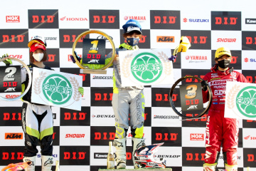 レース中盤、久保選手は2番手に迫られながらもトップを守った。すると5周目、2番手のライダーが転倒。これで本田選手が2番手に浮上し、トップを走る久保選手のリードは約5秒に拡大した。そして、久保選手がそのまま逃げ切って今季2勝目。本田選手が2位、3番手を走りながらラストラップに順位を下げた楠本選手が5位となった。