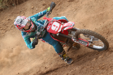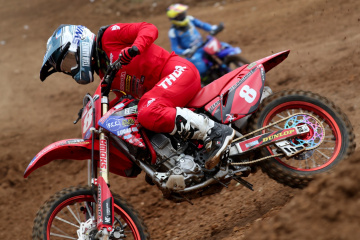決勝ヒート2では、再びウィルソン選手は慎重なスタート。それでも、オープニングラップには3番手まで順位を上げた。また、カワサキのマシンを駆る安原志選手(#13)は6番手、町田選手は8番手からのレースとなった。2周目、ウィルソン選手は1台をパスして2番手に浮上。すると、これにプレッシャーを感じたトップのライダーが単独転倒し、ウィルソン選手は難なく先頭に立った。