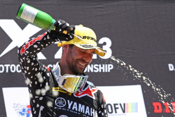 全日本最高峰のIA1クラスは、開幕戦から3戦連続となる15分+1周の3ヒート制。ダンロップ勢のうち、カワサキファクトリーチームの能塚智寛選手(#2)とホンダを駆る小方誠選手(#5)は、前戦で負傷したことから今大会を欠場した。決勝ヒート1では、マシン開発を目的に今季新設されたもうひとつのヤマハファクトリーチームから監督兼選手として参戦する昨年度IA2王者のジェイ・ウィルソン選手(#27)が、スタート直後に3番手の好位置を確保。ウィルソン選手は、オープニングラップにトップまで浮上した。