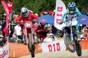 IA1決勝ヒート1では、夏休み期間に米国AMAプロモトクロス選手権にスポット参戦したヤマハファクトリーチームのジェイ・ウィルソン選手(#27)が、ホールショットを奪った。カワサキファクトリーチームの能塚智寛選手(#2)が、1周目に2台をパスして2番手。レース序盤、ウィルソン選手と能塚選手は、それぞれ後続とのギャップを少しずつ拡大した。後方では、カワサキのマシンを駆る安原志選手(#16)が、9周目にヤマハのファクトリーマシンを抜いて5番手となった。レースが後半に入ると能塚選手のペースが落ち、15周目には3番手後退。翌周、安原選手は転倒により大きく順位を下げた。そしてレースは20周でチェッカー。米国で負傷した足首の影響を感じさせない走りでウィルソン選手が独走優勝を決め、能塚選手が3位で表彰台に立った。安原選手は11位となった。