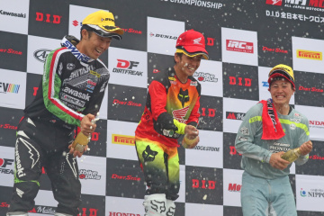 2番手となった能塚選手は、一気に横山選手に迫ったが、転倒してマシン破損でリタイア。これで2番手には、カワサキに乗る安原志選手(#8)、3番手には池谷選手が浮上した。レースは8周でチェッカーとなり、横山選手が優勝し、安原選手がIA1自己最高位の2位、池谷選手がIA1初表彰台の3位。さらにホンダを駆る小方誠選手(#9)が4位、カワサキに乗る神田橋瞭選手(#35)が5位となり、ダンロップ勢がトップ5を独占した。