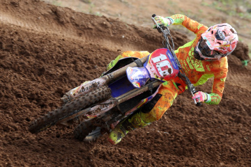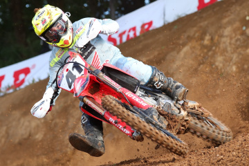 25分+1周の決勝ヒート1では、ホンダサポートライダーの横山遥希選手(#41)がホールショット。まずはトップを快走した。ウィルソン選手は1周目4番手、ガスガスを駆るビクトル・アロンソ選手(#33)は同6番手、カワサキファクトリーチームの能塚智寛選手(#7)は同7番手。4周目には、横山選手とウィルソン選手とアロンソ選手と世界選手権ライダーの4名によるトップ争いとなった。