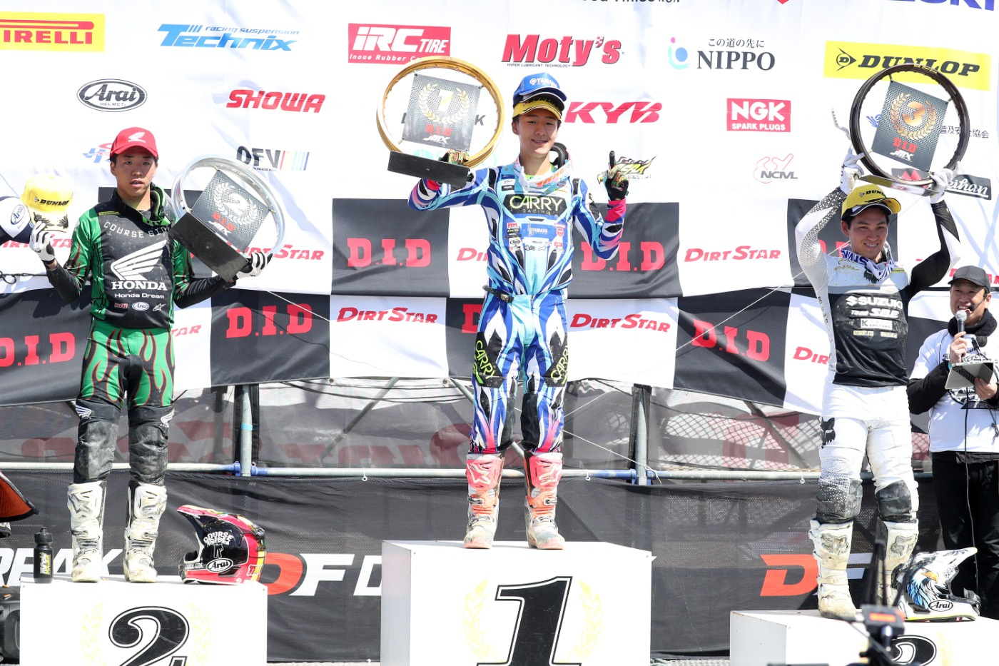 今大会のIA1クラスは、15分+1周の3ヒート制で実施。そのヒート1では、ホールショットの内田選手がすぐに転倒し、まずは大倉選手が先頭に立った。コースは1周目のみ大幅にショートカットされ、2周目からフルコース。その2周目、4番手を走っていた大城選手が転倒して9番手まで後退し、カワサキを駆るベテランの安原志選手(#500)が4番手に浮上した。序盤、トップの大倉選手を3~4秒差で西條選手がマーク。レースが中盤に入ると、西條選手がじわじわと距離を詰め、終盤にはついに僅差となった。するとラスト2周となった11周目の終盤で、大倉選手が転倒。これでトップに立った西條選手がIA1初優勝を遂げた。大倉選手が3位、安原選手が4位、ケガの影響が残るウィルソン選手が5位となった。