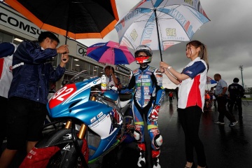 レース1の予選では、鈴木大空翔選手(HONDA)が2位、村瀬健琉選手(HONDA)が3位、岡崎静夏選手(HONDA)選手11位。特別枠で参戦した14歳の濱田寛太選手(HONDA)12位、セナ・アギウス選手(HONDA)15位、藤井謙太選手(HONDA)20位につける。