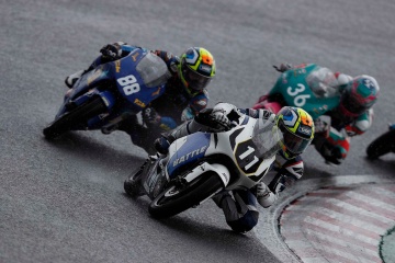 土曜日のレース1は、ヘビー・レインという厳しいコンディションの中で行われた。スタートが切られると鈴木選手が好スタートを決めるが、転倒車がコース上に倒れたために赤旗中断。