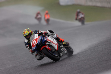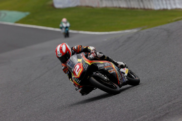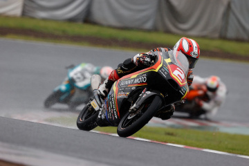 予選は、ウェット・コンディションで行われ小室旭選手(KTM)がポール・ポジションを獲得する。