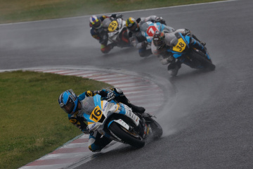 レース2はレイン・コンディションの中でスタート。転倒車が続出する難しい状況の中、中冨選手は安定した走行を続ける。