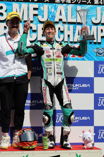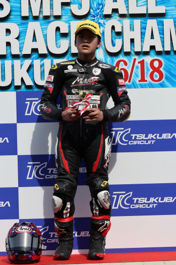「2レース制になり、難しいレースだった。再開レースは14周と短いので、スタート・ダッシュでなるべく逃げるレースがしたいと考えていた。大和選手の方がペースがあるのはわかっていたので、抜き返されたら抜き返すレースをしようと思っていた。最後まで抜かれることなくチェッカーを受けることができてよかった。このクラスに復帰して3年目、筑波では過去2年勝てなかったので、初優勝できたことを本当にうれしいです」