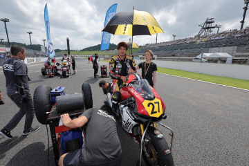 予選日となる土曜日から、いよいよフォーミュラカーが走り出す。JSB1000クラスの予選は12時45分から40分間。気温は34度まで上がり、それに伴って路面温度も50度を超えるコンディションとなった。また天気予報では昼から雨が降ると予想されていたが、結果的には太陽も顔を出し、気温がどんどん上がっていく中での予選となった。