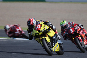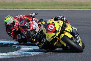 日曜日朝のウォームアップ走行は、JSB1000用としてダンロップ技術陣が準備していたバックアップタイヤを使用した。このセッションでもダンロップタイヤの初期の暖まりの良さを発揮し、2周目に1''49.717をマークしてトップに出る。その後、転倒してピットに戻るが、チームがすぐにマシンを修復。再びコースに戻り、決勝への確認を行った。