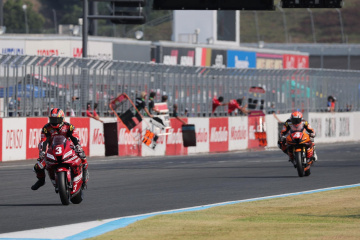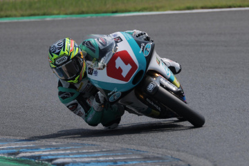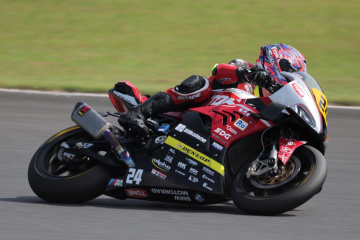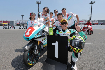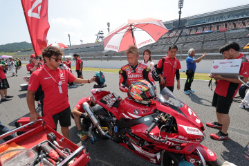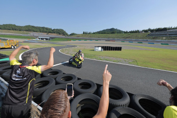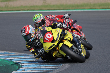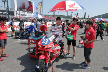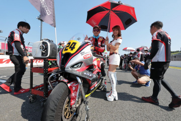 この日の公式発表で気温は37.1度とされたが、スターティンググリッド上で感じる暑さはそれ以上。路面温度も60度を超える中、20周のレースがスタートした。うまくスタートで飛び出した長島選手は3コーナーまでに3番手へ浮上。さらに直後の5コーナーで2番手まで上がると、その先の130Rではトップに立つ。S時入口でインを刺されるが、クロスラインでトップを守る。2周目に2位に落ちるが、それでもペースが落ちることなく、5周目まで2位をキープする。その後、3位となってその位置を維持していたが、10周目あたりから開幕戦のウイナーである水野 涼選手(DUCATI)が背後に迫り、抜きつ抜かれつのバトルを6周にわたって展開する。ペース的には1分50秒台でコンスタントに周回しており、前日より高いレベルで安定している。残念ながら3位表彰台を賭けたバトルは16周目から徐々に広がり、長島選手の初表彰台獲得は果たせなかったが、高いレベルで走り切って4位入賞獲得は、タイヤ開発が進んでいる証となった。
