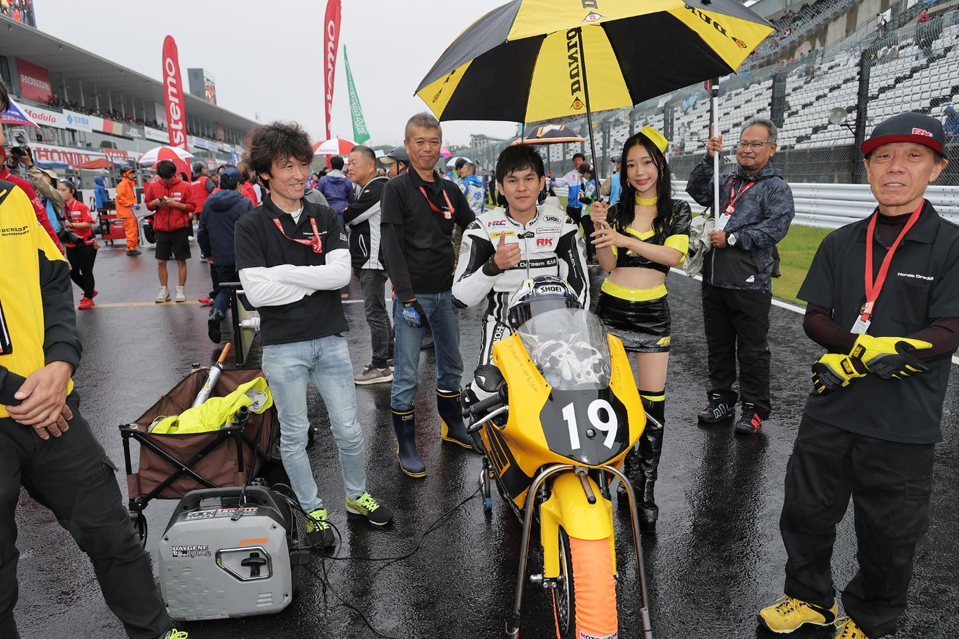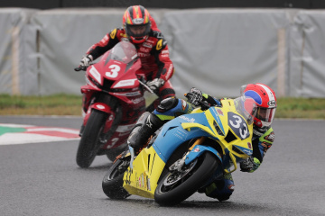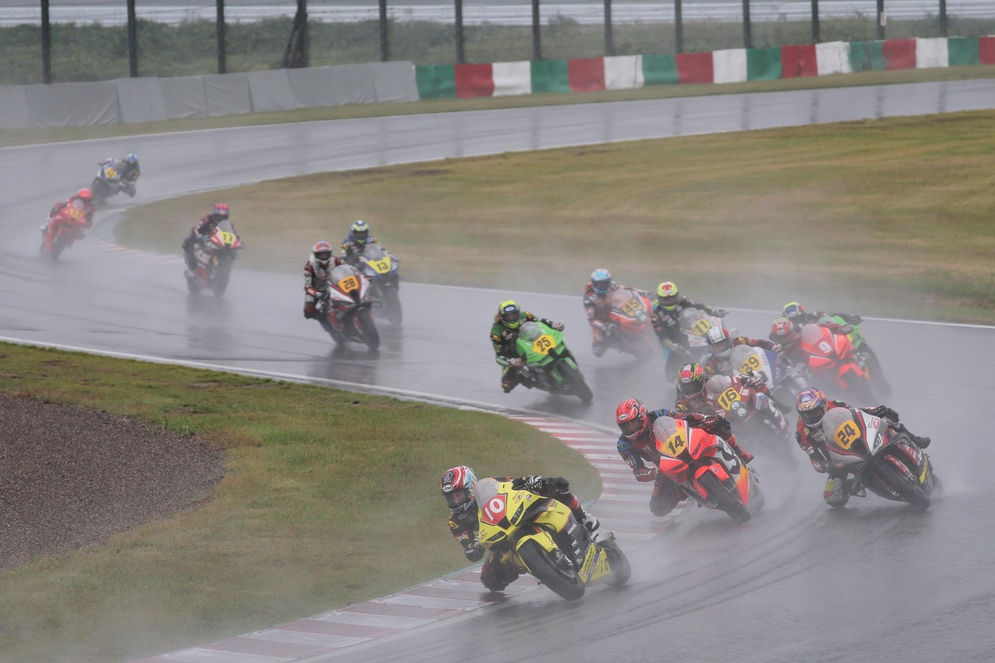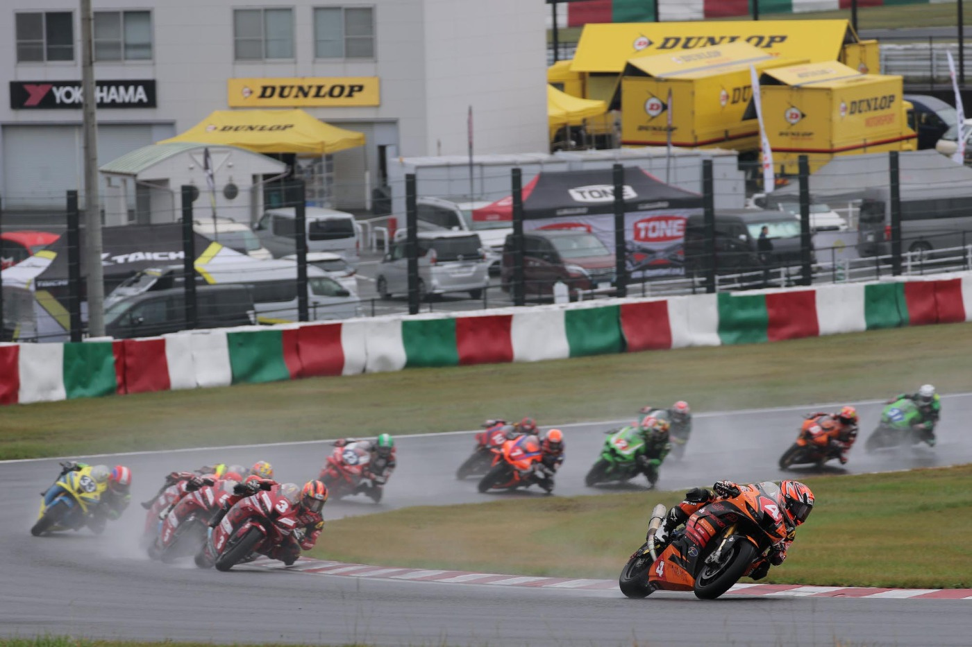 午後になると雨がぱらつき始め、レース1は路面が完全にウエットにならない難しいコンディションでスタート。 ダンロップのエンジニアは予選で使用したスリックタイヤに加え、バックアップとして前戦岡山で実績のあるレインタイヤも用意していた。 気温20度、路面温度21度と低め。まだドライ寄りの路面だったことから、長島選手はサイティングラップをドライタイヤで走行したが、スタート直前に雨量が増したため、グリッド上で急遽レインタイヤに交換して臨んだ。 レースがスタートすると、長島選手は1コーナーを3番手で飛び込み、前の2台に続いた。1周目を3位でメインストレートに戻ってきたが、その後NIPPOコーナーで1台、さらにヘアピンで1台にパスされ5位へ順位を落とす。 6台による3位争いの中で、前に出るチャンスをうかがった。 このグループのペースが2分21〜22秒台であるのに対し、長島選手は2分21〜20秒台と良いため、3周目のスプーン入口で4位に浮上。その後再び抜かれる場面もあったが、すぐに抜き返し、6周目には3位に上がった。 しかし、9周目のシケイン入口でわずかにラインを外し、5位にポジションダウン。 雨が強まる中、2分20〜19秒台にペースを上げていた12周目、S字で転倒。 レースは14周目に入るところで赤旗中断となり、12周で成立。長島選手は14位完走となった。