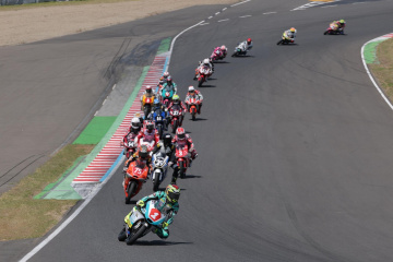 日曜日は朝から晴天に恵まれ、9時時点で気温13度まで上昇。路面温度は30〜31.5度となった。 9時25分から15分間のウォームアップ走行が行われ、長島選手は1周目を1分27秒767で走行し2番手に1.1秒差をつける速さを見せた。 2周目に1分26秒921、4周目に1分26秒864と連続して26秒台を記録。8周目には1分26秒025までタイムを上げ、2番手で終了。決勝への期待が高まった。14時15分、22周のレース2がスタート。長島選手は再び好スタートを決め2番手で1コーナーへ進入。さらにSPインでトップの水野涼選手(DUCATI)のインを突いて首位に浮上。そのままオープニングラップをトップで戻りレースをリードした。 2周目に1分26秒941、3周目に1分26秒537とペースを上げていく。