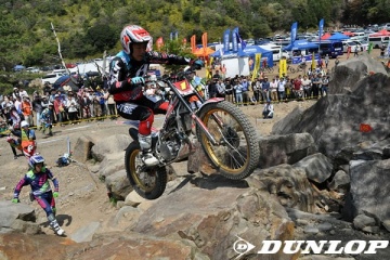 全日本トライアル選手権の今季第2戦となる近畿大会が、4月16日(日)に和歌山県の湯浅トライアルパークで開催された。開幕戦では、昨秋に投入したニューマシンにダンロップタイヤを履かせる黒山健一選手(#2)が圧勝。今大会では、昨年からの4大会連続優勝を狙った。一方、昨年度チャンピオンで同じくダンロップタイヤを愛用する小川友幸選手(#1)は、第1戦で2位となり、この大会には今季初優勝をめざして臨んだ。
