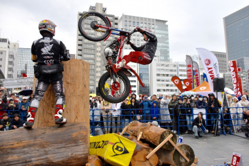 全8戦で競われてきた今季の全日本トライアル選手権シリーズは最終戦を迎え、City Trial Japan 2023 in OSAKA大会が、11月12日(日)に大阪府大阪市中央公会堂前中之島通りで開催された。最高峰の国際A級スーパークラスでダンロップタイヤGEOMAX TRIAL TL01を履く小川友幸選手(#1)は、今大会をランキングトップで迎えた。同じくダンロップタイヤを使用するランキング2番手の氏川政哉選手(#3)とは10点差。最終戦で氏川選手が優勝した場合でも、3位以内に入れば小川選手がチャンピオンとなる。また、こちらもダンロップを愛用するヤマハ電動トライアルバイクで参戦中の黒山健一選手(#2)、今季1勝を挙げている野崎史高選手(#4)、柴田暁選手(#5)や小川毅士選手(#6)らも、優勝でシーズンを締めるべく今大会に臨んだ。