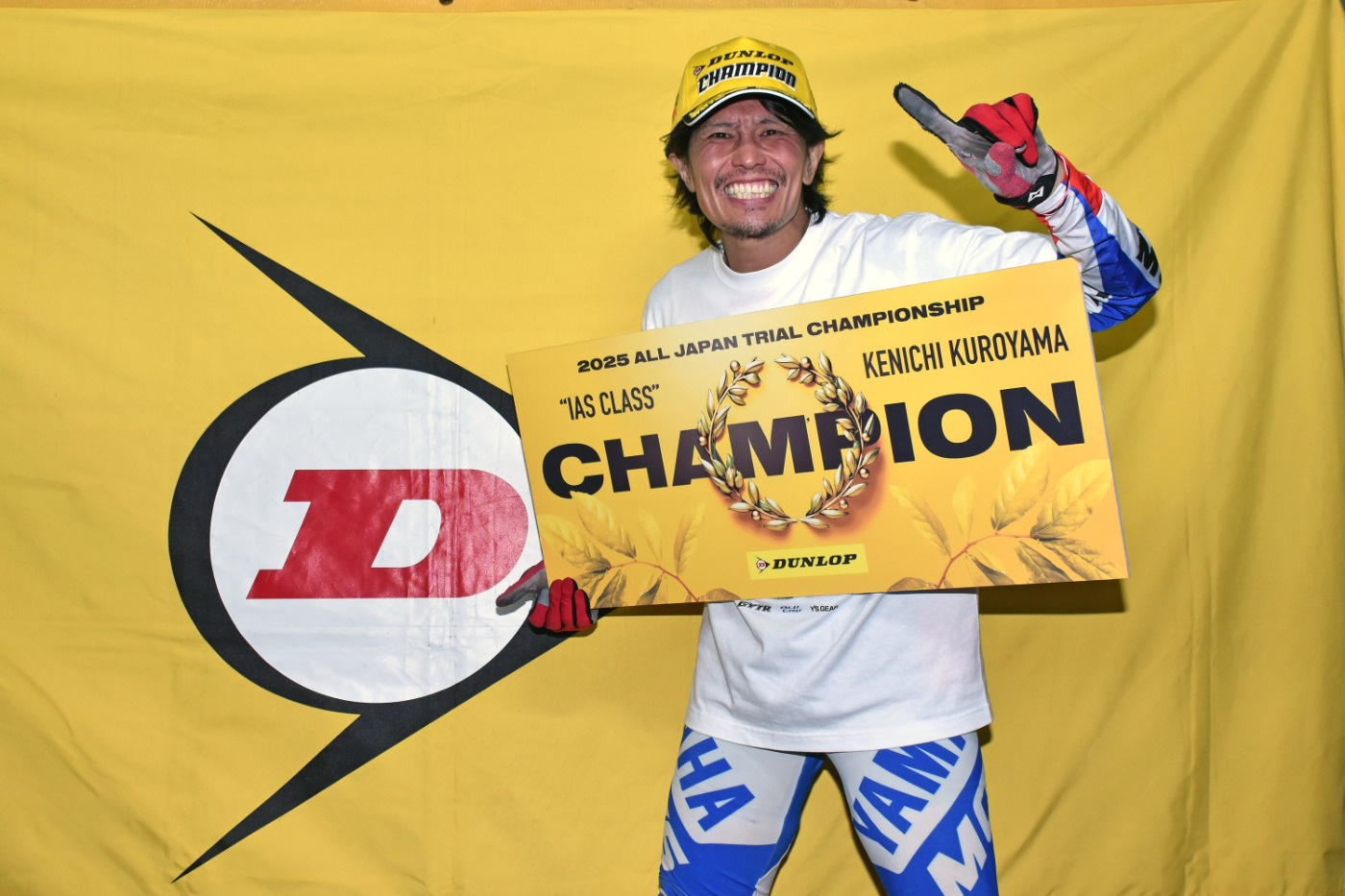 迎えた最終セクションを最初にトライした小川毅士選手は減点5となり、優勝争いから脱落。次に挑んだ黒山選手は、ありえないほど遠くに設置された高さがあり着地面が狭い障害物に対して、大きくジャンプして飛び移る大技を披露し、見事に1点で走破することに成功した。これにより、氏川選手は絶対に失敗できない状況に。そして黒山選手と同じく氏川選手も大技にチャレンジしたが、結果は減点5となり、黒山選手が大逆転勝利を収めて、13年ぶり通算12度目の王者返り咲きに花を添えた。なお、電動トライアルバイクでの国際A級スーパークラスチャンピオンは史上初で、新たな歴史の幕開けをダンロップタイヤが支えた。