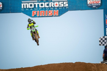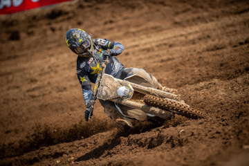 450クラスのヒート1、ホールショットを奪ったのはアダム・シアンサルーロ(カワサキ)だった。背後にはザック・オズボーン(ハスクバーナ)、イーライ・トマック(カワサキ)、ムスキャン、ジャスティン・バーシア(ヤマハ)が続く。2周目にはバーシアとムスキャンが接触し、ポジションが入れ替わった。ハーフウェイポイントに差しかかる頃には、上位3台が接戦となり、バーシアが離された。