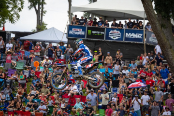 マディに見舞われた年(2014、2018)の印象が強く残るアイアンマンだが、近年は好天に恵まれベストコンディションが続いている。午前中に実施されたクオリファイングセッションの結果は、450=チェイス・セクストン(ホンダ)1分58秒817、250=ジャスティン・クーパー(ヤマハ)2分00秒271が最速だった。