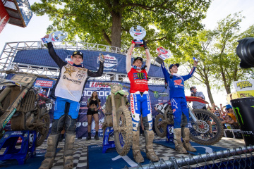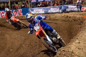 元来の硬質土にサンドを混ぜて改善された路面は、全周にわたって耕されてザクザクの状態。走行セッションが進むと深いワダチが形成され、中でもスムーズなレールがベストラインに選ばれていった。クオリファイで最速だったのは、450=イーライ・トマック(ヤマハ)2分02秒784、250=下田丈(カワサキ)2分03秒742。下田は昨年のレッドバッドでもポールポジション争いをしており、コースに対する相性が表れたタイムアタックとなった。