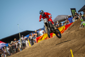 クオリファイングセッションで最速だったのは、450=ジェット・ローレンス(ホンダ)2分06秒287、250=ジャスティン・クーパー(ヤマハ)2分06秒947。ハードパックを掘り起こした路面は、予選走行によってワダチが刻まれ、決勝が行われる頃にはブレーキングバンプなどが増え、難易度の高いコンディションになった。