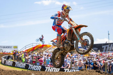 450クラスのヒート1(30分+2周)は、ハンター・ローレンス(ホンダ)のホールショットで始まった。レッドプレートを装着するポイントリーダーの背後には、ジェット・ローレンス(ホンダ)、ディラン・フェランディス(ホンダ)、ジャスティン・クーパー(ヤマハ)が続く。4周目、H・ローレンスがバランスを崩した隙に、J・ローレンスが前に出た。