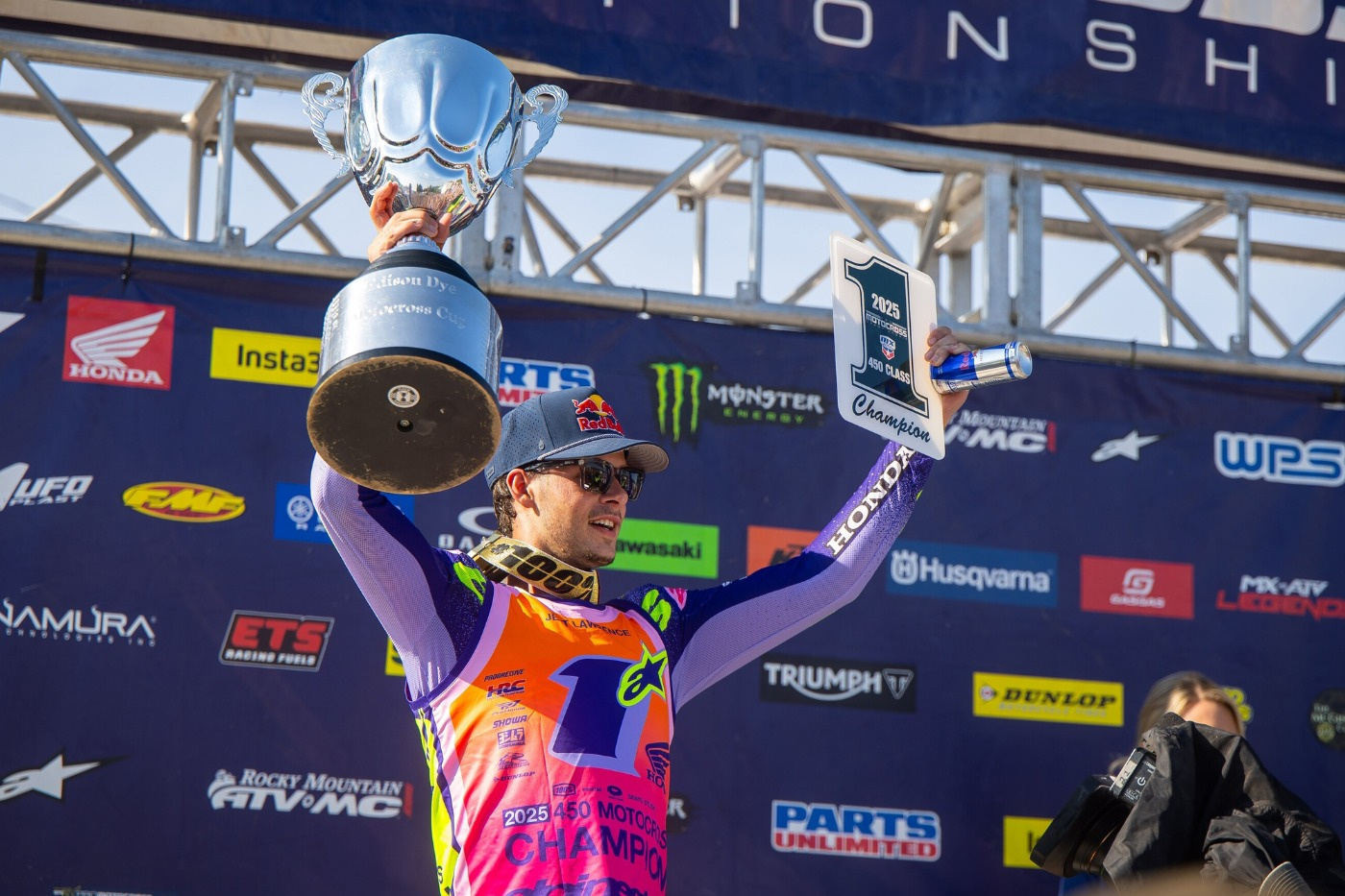 J・ローレンスは、第8戦ワシューガル、第9戦アイアンマンで総合優勝を逃してきたが、チャンピオン決定戦となった今大会で、パーフェクトウィン(1位/1位)を果たし、450クラスのタイトル奪回に成功した。ダンロップにとっては、16年連続のチャンピオンシップ制覇である。