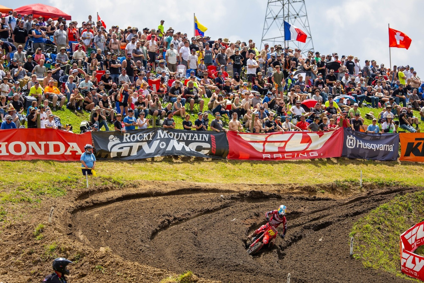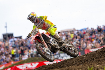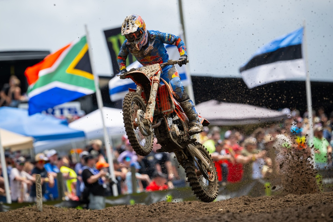 450クラスのモト2スタート直前から、強い雨が降り出した。オープニングラップのリーダーは、ホールショットのH・ローレンスをかわしたイーライ・トマック(ヤマハ)。一方モト1ウィナーのJ・ローレンスは、出遅れて1周目のコントロールラインを9位で通過した。トマックはマディを味方に独走し、9周目には12秒の大差をつけた。そして残り時間が7分02秒となったところで、雷の接近によってレッドフラッグが振られた。