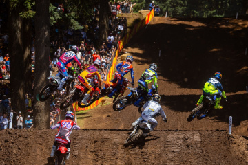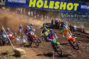 450クラスのモト2では、ハンター・ローレンス(ホンダ)がホールショットを決めたが、3周目にはJ・ローレンスがリーダーになった。その直後、レッドフラッグが振られてレースが中断。スーパークロスでは斜めに並ぶスタッガードスタートが実施されるが、初適用となったアウトドアモトクロスでは、イン側のゲートからJ・ローレンス、H・ローレンス、セクストンという順に並び、オフィシャルの合図で時間差を付けた再スタートとなった。レッドフラッグ直前の3周目のオーダー通りである。