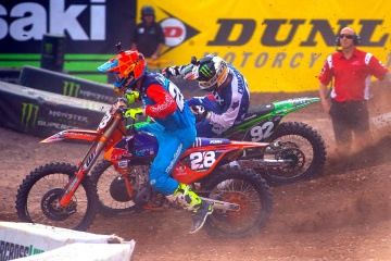 450SXのメインレース(20分+1周)では、ジェイソン・アンダーソン(ハスクバーナ)が、スタート直後の1コーナーで転倒するアクシデントが発生した。今大会で4位以上に入ればタイトルが確定する状況だったが、アンダーソンはこの転倒で前輪のスポークを破損し、ピットインを強いられることになった。