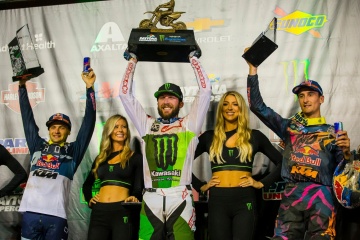 450SXのメインレース(20分+1周)では、ブレイク・バゲット(KTM)がホールショットを取った。2コーナーではマルチクラッシュが発生し、その中にはランキング2位のケン・ロクスン(ホンダ)も巻き込まれた。オープニングラップのオーダーは、バゲットを先頭にイーライ・トマック(カワサキ)、ムスキャン、クーパー・ウェブ(KTM)。上位陣は序盤から激しいバトルを繰り広げたが、一時先行されたムスキャンとバゲットを制圧したトマックが、4周目にリーダーとなった。