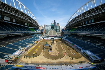 シアトルSXはマディコンディションとの闘いである。会場がオープンエアのセンチュリーリンク・フィールドに移ってからは、非常に高い確率で雨の影響を受けてきたが、今年は5年ぶりにドライ路面が実現した('18年マディ、'17年マディ、'16年不開催、'15年不開催、'14年ドライ)。シアトルの土は軟質で石の混入が多い特徴があるが、今年は普段よりも硬めでワダチやギャップの発生は少なかった。穏やかではあったが日差しで乾燥が進み、コースには小まめな撒水が必要になるほどだった。