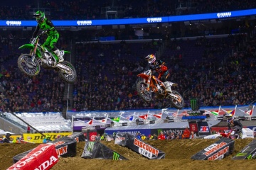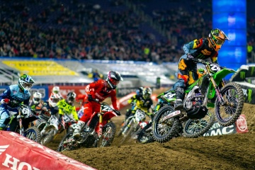 前戦サンディエゴまでで250SXウエストは中断し、今回がイースト開幕戦となる。450SXのエントラントに変化はないが、250SXではウエストからイーストに入れ替わる。昨年のミネアポリスでは、3レースの総合結果で競われる「トリプルクラウン」方式が実施されたが、今年は通常のフォーマットで行われた。19時からのナイトレースに進む40台を決めるタイムドプラクティスでは、ジョーイ・サバッチー(カワサキ)46秒767=450SX、オースティン・フォークナー(カワサキ)46秒641=250SXが、各々リーダーボードのトップに表示された。