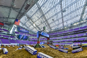 ミネソタ・バイキングスの本拠地、あるいはX GAMESの開催地としても有名なUSバンク・スタジアムだが、スーパークロスが行われるのは今年で3度目。寒冷地における常として、コース作りは凍った土をバーナーで炙ることから始まる。完成する頃にはウェットで軟らかい土になるが、その度合は一様ではなくセクションによって異なる。プラクティスが始まるとすぐにワダチが掘れて、小石が露出する箇所も多々あった。館内は暖房されていたが、走行前にタイヤウォーマーを使用するチームもあった。