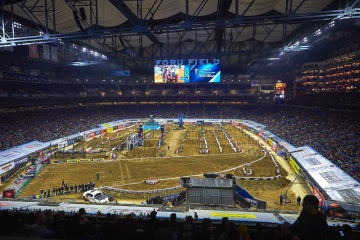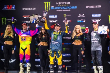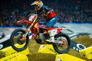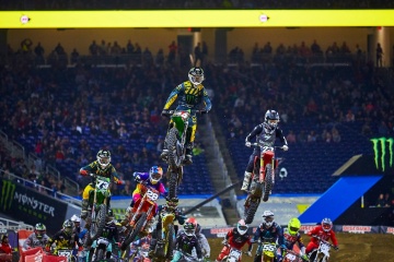 250SXイーストを走るライダーにとっては、今シーズン初のトリプルクラウン大会。メインレース1(10分+1周)は、オースティン・フォークナー(カワサキ)のホールショットで幕を開けた。オープニングラップでジョーダン・スミス(KTM)が前に出たが、2周目にはフォークナーがトップの座を奪回。スミス、セクストンらの追走を振り切り、フォークナーがリードを広げた。14周でチェッカーが振られたレース1のリザルトは、1位フォークナー、2位スミス、3位には最終ラップでセクストンをかわした、ジャスティン・クーパー(ヤマハ)が入った。