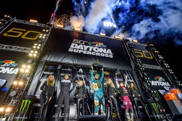発祥から50年目を迎えたデイトナ・スーパークロスが、聖地スピードウェイで開催された。誕生した当初は現在のようなシリーズがなく、1971年トランズAMA、1972~73年AMAナショナルの一部として扱われた。1974年からAMAスーパークロスとして47回実施されてきたデイトナ大会だが、今回は50年目のアニバーサリーを祝福する趣向が随所に凝らされていた。