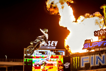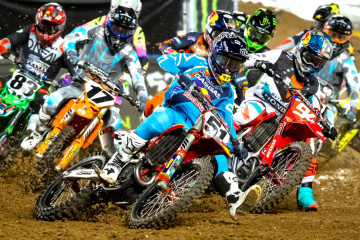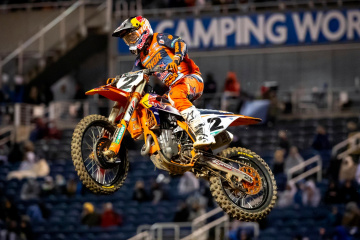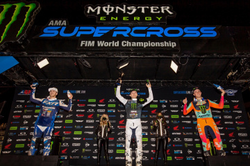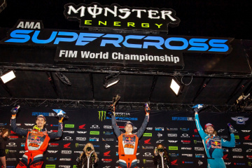 250SXのメインレース(15分+1周)は、クーパーのホールショットで始まった。ところが1周目に別々の場所で発生した、ジェレミー・マーティン(ヤマハ)とアレックス・マーティン(スズキ)のクラッシュを受け、レッドフラッグが振られた。マーティン兄弟を除いた20台による再スタートでは、またしてもクーパーがホールショット。序盤の混戦の中で転倒が多発し、ジョーダン・スミス(カワサキ)、セス・ハメイカー(カワサキ)がトップグループから脱落した。