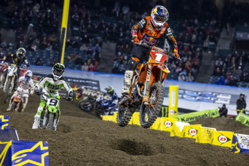 450SXのメインレース(20分+1周)は、ケン・ロクスン(ホンダ)のホールショットで幕を開けた。チェイス・セクストン(ホンダ)、アダム・シアンサルーロ(カワサキ)、シェイン・マケラス(KTM)が続く。ホンダ同士のトップ争いが次第に激しくなると、3位との間隔が広がる。セクストンのチャージが勢いを増し、バトルはサイドバイサイドに発展したが、9周目にセクストンが転倒し、ロクスンは単独リーダーとなった。セクストンは11周目に2度目のクラッシュを喫し、大きく後退した。