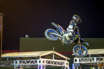 クオリファイングセッション(10分×2回)でベストタイムを出したのは、450SX=チェイス・セクストン(ホンダ)1分03秒046、250SX=クリスチャン・クレイグ(ヤマハ)1分04秒242。1分を超える長いコースになったのは、スタートストレートを横断して折り返す部分もあるため。ラップタイムが長くなれば、周回数が減るのでジャンプの角などが崩れにくくなる。好天続きで土質の硬化が進んだこともあり、難易度は刻一刻と増す一方だった。