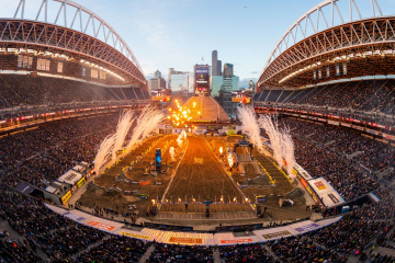 オープンエアのルーメン・フィールドで開催されるシアトルSXには、雨に翻弄されてきた歴史がある。コースコンディションを振り返ってみると、'22年ドライ(小雨)、'21年不開催、'20年不開催、'19年ドライ、'18年マディ、'17年マディ…という状況だ。気象データによると、シアトルにおける1~3月の降雨日は月平均15日前後で、2日に1度は雨という確率だ。レース開催日が好天だったとしても、コース作りの途中で雨に降られると、路面が乾ききらないことが多い。