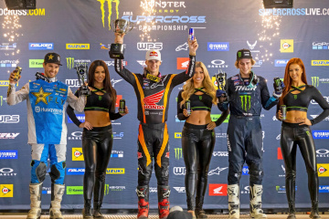 今回は1コーナーまで約110メートルのストレートを設けてもなお、スタートラインの裏側にフィニッシュジャンプを配置できる余裕がある。長さと広さに恵まれたレイアウトだが、ハードパックでワダチの少ない路面状況もあって、1周1分弱のハイスピードコースになった。クオリファイングセッションでの最速タイムは、450SX=チェイス・セクストン(ホンダ)56秒248、250SX=ジェット・ローレンス(ホンダ)56秒930。常連がポールポジションを占めた。