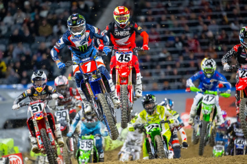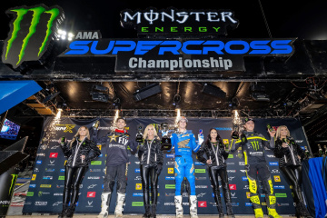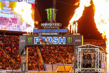 クオリファイングセッションでポールポジションをゲットしたのは、450SX=マルコム・スチュワート(ハスクバーナ)50秒008、250SX=ジェット・ローレンス(ホンダ)50秒099。連続ジャンプのまとめ方によっては、450と250のベストラップが対等なコースレイアウトだと言えた。