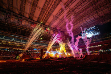 ゲートから1コーナーまでの距離が短いショートスタートが、フットボールスタジアムで採用されるのは、フロアの長辺になるべく多くのセクションを設けて変化を付けるためだ。今年のレイアウトは、2019年ヒューストンSXを彷彿とさせる。相違点は1コーナーを90度→180度に変更したこと、サンドセクションが弧を描いて長めに設置されたこと、そして距離を稼ぐためスタートストレートを横断して折り返すことなどだ。立体交差やヘアピンコーナーの配置は、レプリカと呼べるほど共通点が多い。