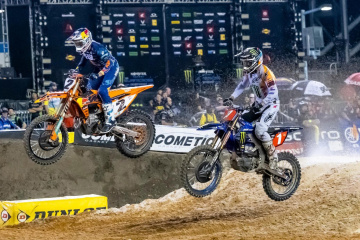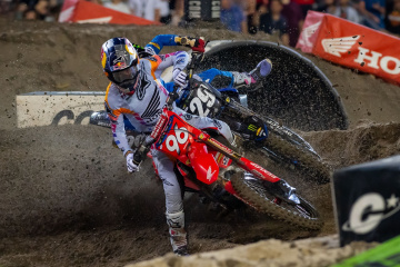 450SXのメインレース(20分+1周)は、イーライ・トマック(ヤマハ)のホールショットで始まった。オープニングラップの競り合いで、クーパー・ウェブ(KTM)が前に出る。一旦下がったトマックの後ろには、セクストン、ジャスティン・バーシア(ガスガス)、ジェイソン・アンダーソン(カワサキ)が続いた。ウェブとトマックは、接触するほど激しいバトルを繰り広げながら、3位以下を引き離していった。