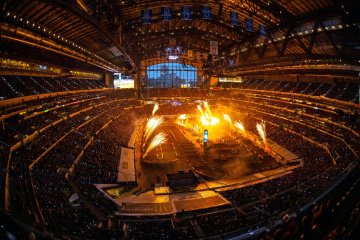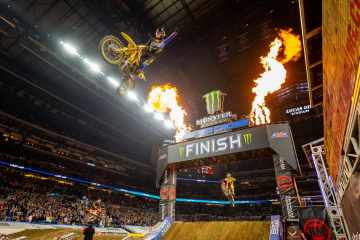 インディアナポリスのルーカスオイル・スタジアムは、6万を超す観衆を収容できる巨大な施設。開閉式ルーフを持つ多目的スタジアムだが、アメリカンフットボールを基準としているフロア面積は意外と狭い。例えばLAコロシアムなどは、フットボール用フィールドの外側に陸上競技のトラックがあるので広いが、サイドラインやエンドゾーンから観客席が近いスタジアムでは、自ずとスーパークロスコースも狭くなる。当地はその典型だ。