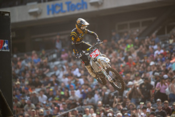 450SXのメインレース(20分+1周)は、チェイス・セクストン(KTM)のホールショットで始まった。クーパー・ウェブ(ヤマハ)、シェイン・マケラス(ホンダ)、ジャスティン・バーシア(ガスガス)、アーロン・プレシンガー(KTM)が続き、オープニングラップのトップグループが定まる。開始早々タイトル争いの構図となったが、スピードに勝るセクストンが、ランキング首位のウェブを徐々に引き離していった。