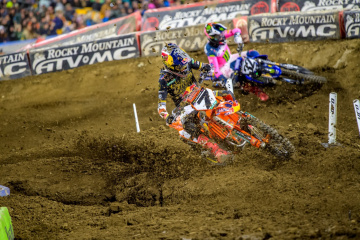 450SXのメインレース(20分+1周)は、クーパー・ウェブ(ヤマハ)のホールショットで始まった。セクストンを挟んで、アーロン・プレシンガー(KTM)、ジャスティン・クーパー(ヤマハ)、ケン・ロクスン(スズキ)が続く。4周目にはロクスンが3位まで浮上したが、1~2位はすでに3秒以上先行していた。