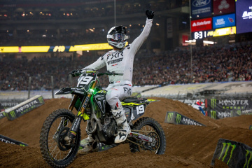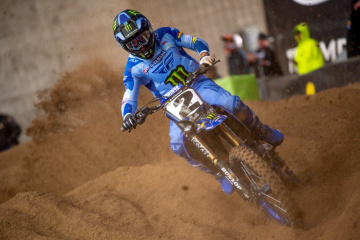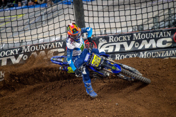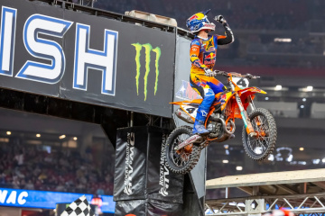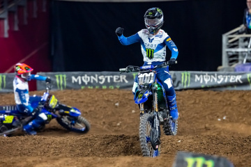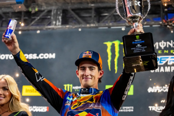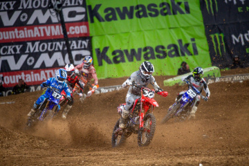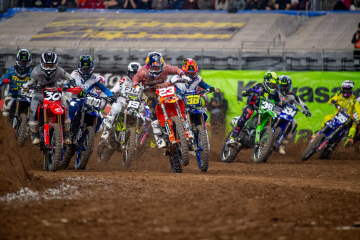 450SXのトリプルクラウンレース1は、クーパー・ウェブ(ヤマハ)のホールショットで始まった。ハンター・ローレンス(ホンダ)、マルコム・スチュワート(ハスクバーナ)が背後につけたが、2周目にはJ・ローレンスが2位に上がった。ウェブとのトップ争いが延々と続いたが、クーパーが逃げ切りチェッカーを受けた。J・ローレンスを挟んで3位には、スタート7位から追い上げたチェイス・セクストン(KTM)が入った。