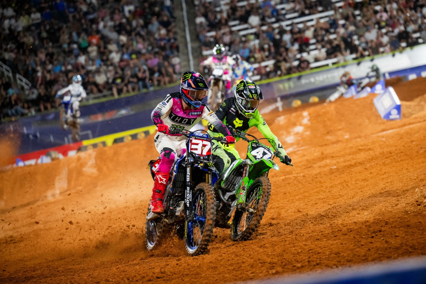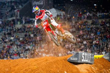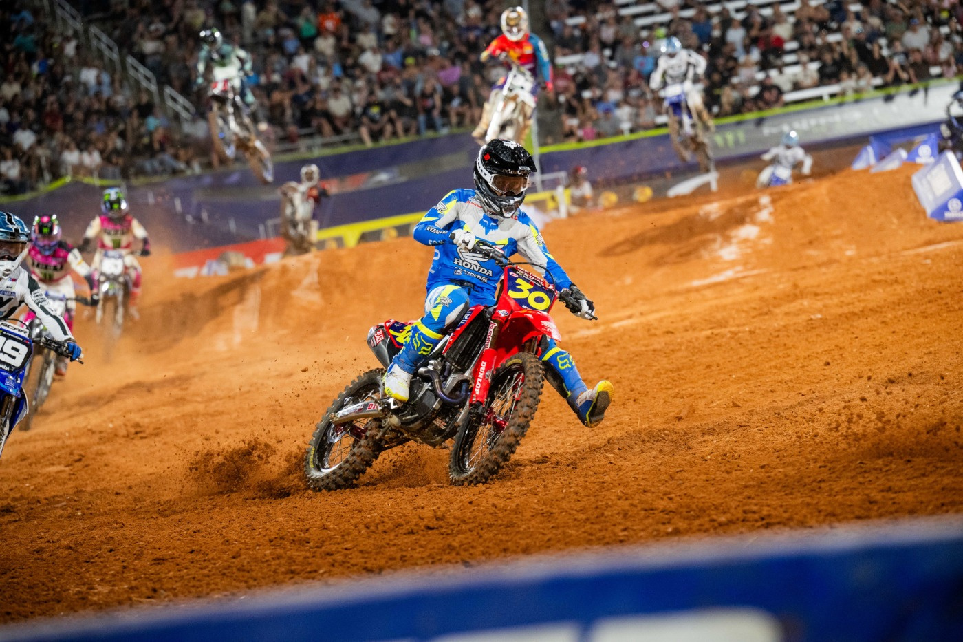 450SXのメインレース(20分+1周)では、ハンター・ローレンス(ホンダ)がホールショットのホルヘ・プラード(KTM)をかわし、オープニングラップからトップに立った。3位にはトマックが控えていが、予選ヒート中に接触でマシンを損傷し、ラストチャンスから決勝進出を果たしただけに、トマックのスタートには多くの関心が寄せられていた。